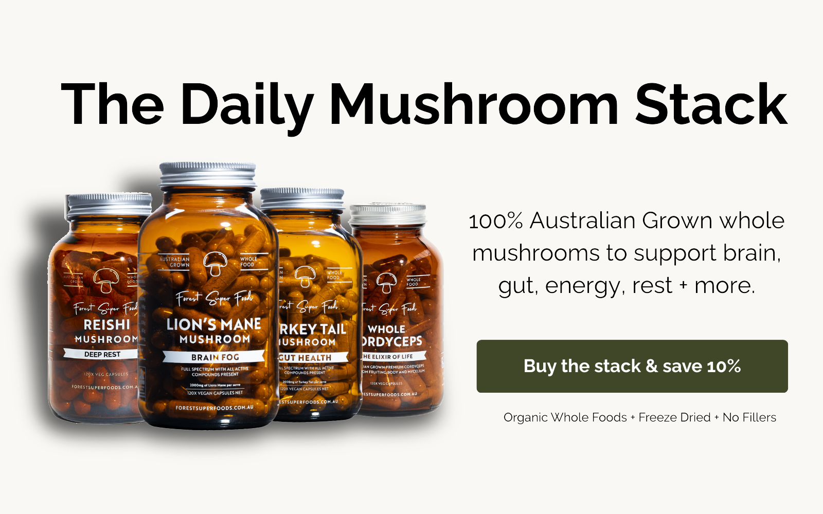 A bottle of Australian Grown Lion's Mane Mushroom capsules by Forest Super Foods. 2,000+ Verified Customer Reviews. Great for brain fog and productivity.